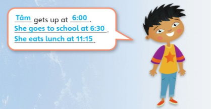 Tâm thức dậy lúc 6 giờ. Cô ấy đến trường lúc 6 rưỡi. Cô ấy ăn trưa lúc 11:15.