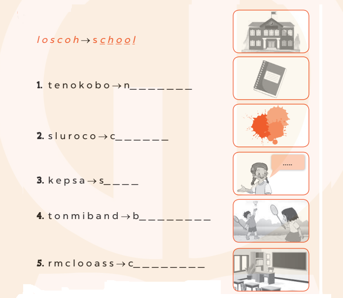 (Mình đang ở trong lớp học. Đây là cái cặp sách của mình. Nó màu nâu. Mình có một quyển sách tiếng Anh, một cái bút, một cái bút chì, một cái thước và một quyển vở.)