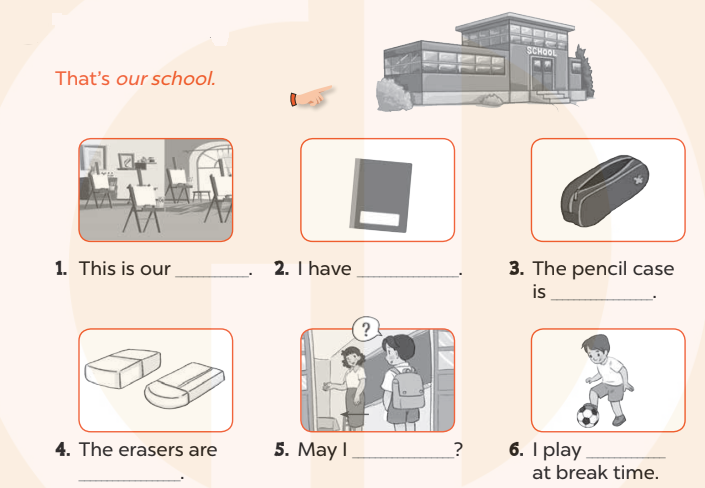 I am in my classroom now. This is my school bag. It is (1) ______. I (2) ______ an English book, a pen, a pencil, a ruler and a notebook. It (3) ______ break time now. I play (4) ______ at time.