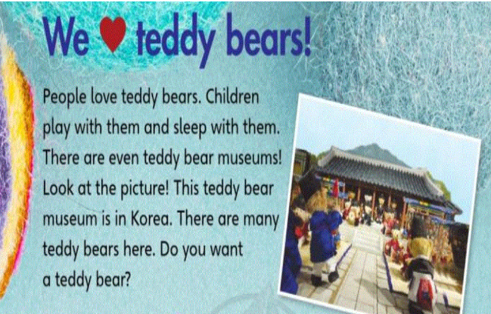 museums! Look at the picture! This teddy bear museum is in Korea. There are many teddy bears here. Do