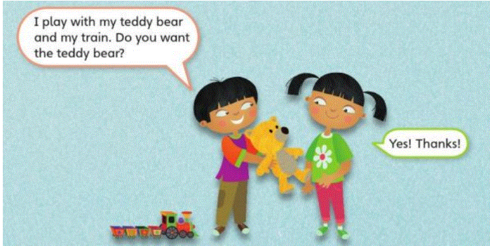 – Tôi chơi với gấu bông của tôi và chiếc xe lửa của tôi. Bạn có muốn gấu bông không?