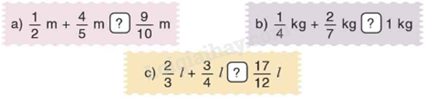 c) Ta có: $\frac{2}{3} + \frac{3}{4} = \frac{8}{{12}} + \frac{9}{{12}} = \frac{{17}}{{12}}$. Mà $\frac{{17}}{{12}}l = \frac{{17}}{{12}}l$