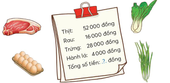 – Tính tổng số tiền mua thịt, rau, trứng, hành lá