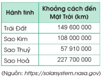 Khoảng cách từ Trái Đất, Sao Kim, Sao Thủy, Sao Hỏa đến Mặt Trời được biểu thị trong bảng bên. Hãy sắp xếp khoảng cách từ các hành tinh trên đến Mặt trời theo thứ tự từ gần nhất đến xa nhất.