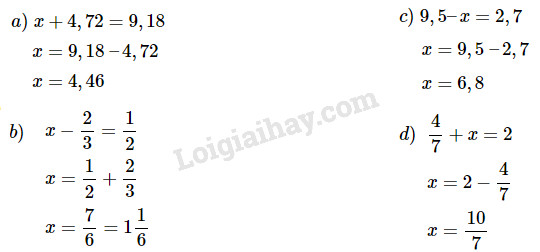 \(c) \;\displaystyle 9,5 – x = 2,7\)                                        \(d) \;\displaystyle{4 \over 7} + x = 2\)