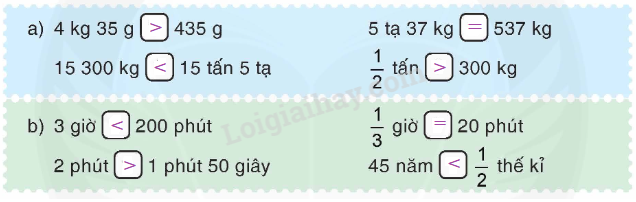 Đổi các các vế sang cùng một đơn vị đo rồi điền dấu thích hợp