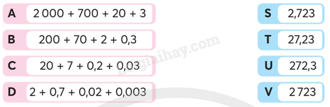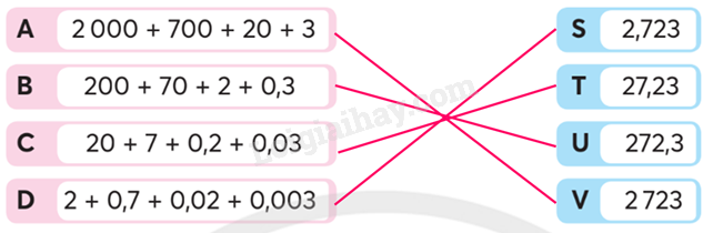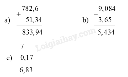 Chọn kết quả thích hợp với mỗi tổng. Đặt tính rồi tính: a) 782,6 + 51,34 b) 9,084 – 3,65 c) 7 – 0,17 Tính bằng cách thuận tiện. a) 95,4 + 0,16 + 4,6 b) 3,82 + 1,88 + 2,18 + 2,12