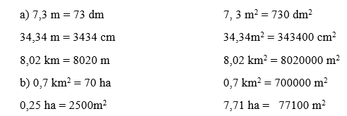Áp dụng cách chuyển đổi các đơn vị đo độ dài và đơn vị đo diện tích rồi viết số thích hợp vào chỗ chấm.