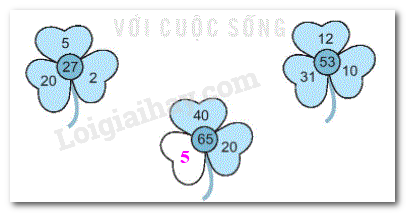Quan sát 2 bông hoa ở hai bên ta thấy tổng 3 số hạng ở cánh hoa bằng số ghi trên nhụy hoa. Từ đó ta tính được số hạng còn thiếu trên cánh hoa của bông ở giữa.