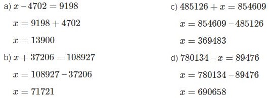 \(c)\;485126 + x = 854609\)                      \(d)\;780 134 – x = 89476\)