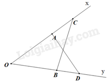 Cho góc nhọn \(xOy\). Trên tia \(Ox\), lấy hai điểm \(A\) và \(C\). Trên tia \(Oy\) lấy hai điểm \(B\) và \(D\) sao cho: \(OA = OB,{\rm{ }}OC = OD\) (\(A\) nằm giữa \(O\) và \(C\); \(B\) nằm giữa \(O\) và \(D\)).