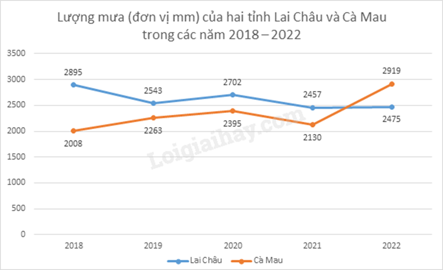 Biểu đồ dưới đây biểu diễn lượng mưa (đơn vị mm) của hai tỉnh Lai Châu và Cà Mau trong các năm 2018 – 2022.(Nguồn: Tổng cục thống kê)