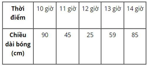 Bạn Hiếu Minh làm thí nghiệm đo chiều dài bóng của một cái cọc in trên mặt đất vào một số thời điểm trong một ngày trời năng và thu được kết quả cho trong bảng sau: