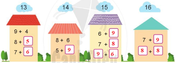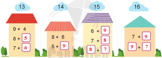 Chẳng hạn, ta có 8 + 5 = 13, do đó số thích hợp điền vào ô trống thứ nhất ở ngôi nhà đầu tiên là 5.
