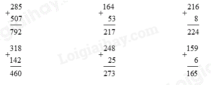 Tính. Đặt tính rồi tính: 285 + 507 164 + 53 216 + 8 318 + 142 248 + 25 159 + 6 Chọn kết quả đúng với mỗi phép tính: