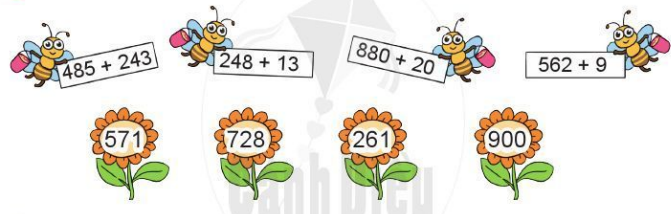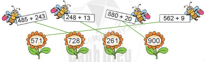 Tính kết quả các phép cộng rồi nối với bông hoa ghi kết quả đó cho thích hợp.