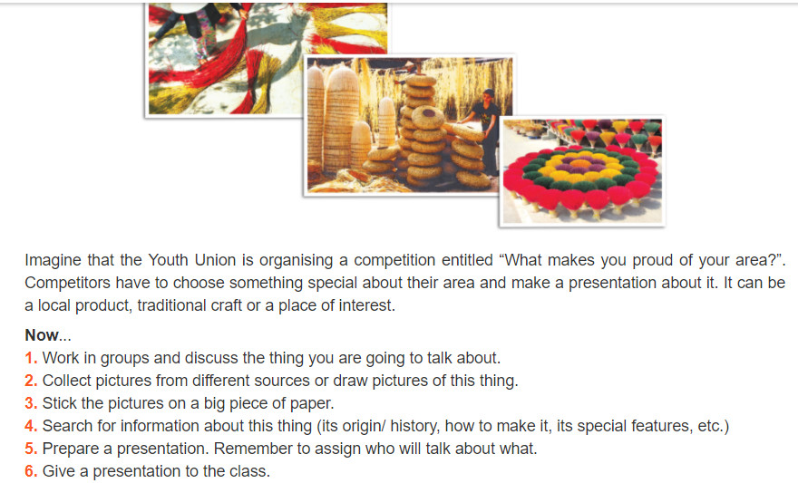 Tưởng tượng Đoàn Thanh Niên đang tổ chức một cuộc thi mang tên: ” Điều gì khiến bạn tự hào về quê mình”. Người tham gia phải chọn một điều đặc biệt và thuyết trình về nó. Có thể là một sản phẩm địa phương, đồ thủ công mỹ nghệ hoặc 1 địa danh thu hút.