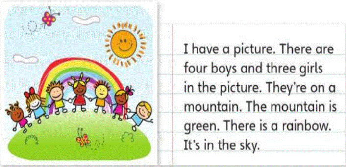 (Tôi có một bức tranh. Có 4 cậu con trai và 3 cô gái ở trong bức tranh. Họ ở trên núi. Ngọn núi màu xanh lá. Có một cầu vồng. Nó ở trong bầu trời.)