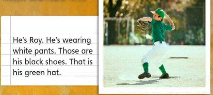 – He’s Mark. He’s wearing a black T-shirt and gray pants. Those are his black shoes. That’s his ball.