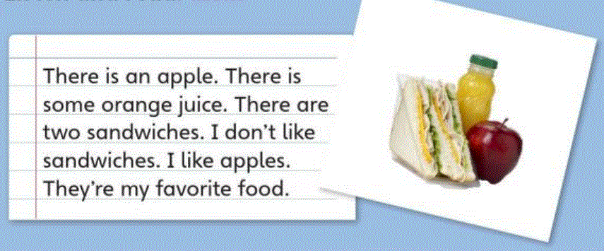 Có một quả táo. Có một ít nước cam. Có hai cái bánh mì kẹp. Tôi không thích bánh mì kẹp. Tôi thích táo.