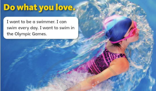 I want to be a swimmer. I can swim every day. I want to swim in the Olympic Games.