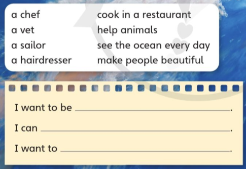 (Tôi muốn trở thành thủy thủ. Tôi có thể thấy biển mỗi ngày.)