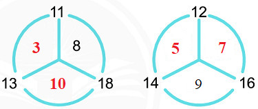 Quan sát ví dụ mẫu ta thấy mỗi số bên ngoài bằng tổng của hai số liền kề ở bên trong, từ đó số còn thiếu bằng số bên ngoài trừ đi số hạng đã biết bên trong.