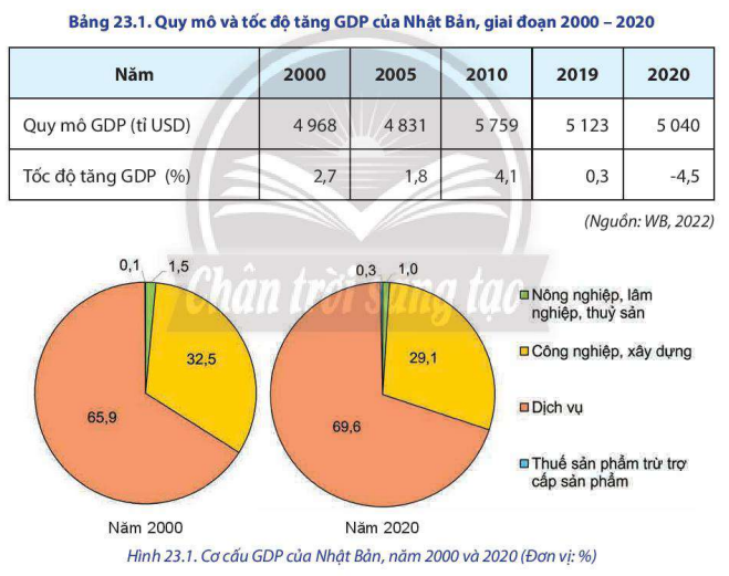 Dựa vào bảng 23.1, hình 23.1 và thông tin trong bài, hãy: Nhận xét về quy mô, tốc độ tăng trưởng và cơ cấu GDP của Nhật Bản, giai đoạn 2000 – 2020. Trình bày tình hình phát triển kinh tế của Nhật Bản. Giải thích nguyên nhân phát triển kinh tế của Nhật Bản.