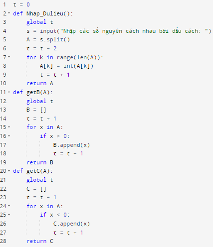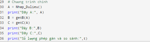 Với mỗi nhiệm vụ trên sẽ được viết riêng thành một hàm. Để tính số các phép gán và so sánh cần một biến tổng thể t. Biến nhớ này sẽ được khai báo lại trong mỗi chương trình con với từ khóa global