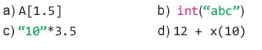 d) Nếu có lỗi xảy ra thì có thể là các loại lỗi sau đây: TypeError nếu dữ liệu (số 10) truyền vào đối số của hàm x() bị sai kiểu, hoặc NameError nếu hàm x() chưa được định nghĩa trước đó, hoặc TypeError nếu giá trị trả lại của hàm x(10) không cùng kiểu để có thể thực hiện phép toán 12 + x(10).