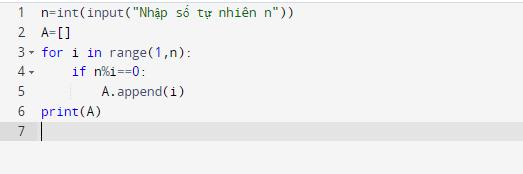 1. Giả sử em được yêu cầu viết một chương trình nhập số tự nhiên n từ bàn phím, kết quả đưa ra là danh sách các ước số thực sự của n, tính cả 1 và không tính n. Hãy viết chương trình và kiểm tra các khả năng sinh lỗi khi thực hiện chương trình.