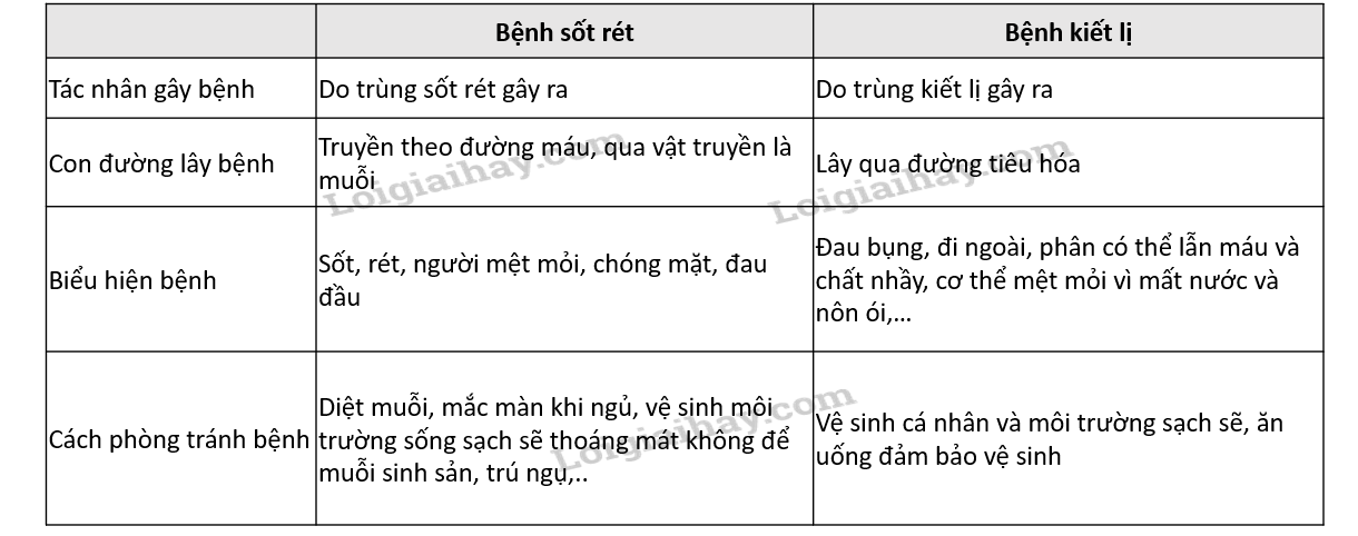 Dựa vào những thông tin về bệnh sống rét và bệnh kiết lị mà em đã học, hãy hoàn thành bảng sau: