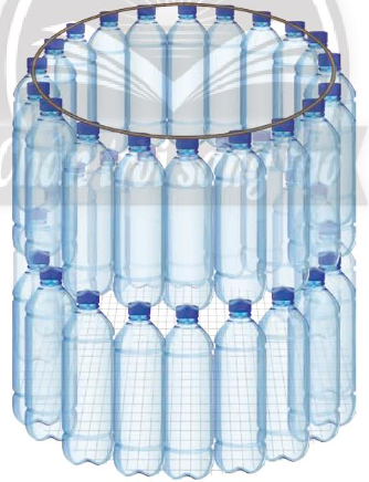Hình ảnh dưới đây là một thùng rác làm từ vỏ chai nhựa đã qua sử dụng. Thùng rác có dạng khối trụ gồm 2 lớp chai với số lượng bằng nhau. Đáy của thùng rác là một tấm lưới để ngăn rác rơi xuống đất.