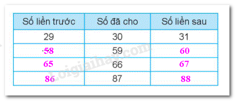 Tìm các số liền trước và số liền sau của số đã cho rồi viết vào ô trống cho thích hợp.