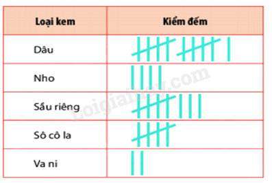 Nhà bạn Mai mở tiệm kem, bạn ấy muốn tìm hiểu về các loại kem yêu thích của 30 khách hàng trong sáng chủ nhật và thu được kết quả như sau: