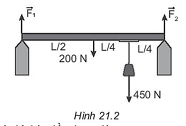 Một thanh đồng chất có chiều dài L, trọng lượng 200 N, treo một vật có trọng lượng 450 N vào thanh như Hình 21.2. Lực \(\overrightarrow {{F_1}} \) của thanh tác dụng lên hai điểm tựa có độ lớn là bao nhiêu?