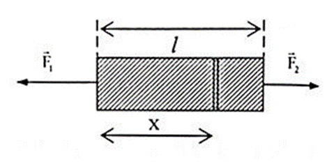 Thanh đồng chất có tiết diện không đổi, chiều dài l, đặt trên mặt bàn nhẵn nằm ngang. Tác dụng lên thanh hai lực kéo ngược chiều nhau F1 > F2 như hình vẽ. Xét một phần rất nhỏ của thanh đồng chất có chiều dài Δx ở vị trí tiết diện của thanh cách đầu chịu lực F1 một đoạn x cách đầu F2 một đoạn ℓ – x – Δx.