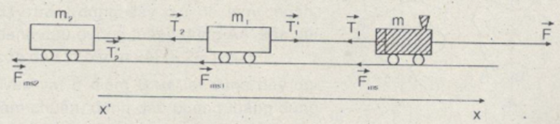 \(a = \frac{{F – {F_{ms}} – {F_{ms1}} – {F_{ms2}}}}{{m + {m_1} + {m_2}}} = \frac{{F – \mu g(m + {m_1} + {m_2})}}{{m + {m_1} + {m_2}}} \Rightarrow F = (m + {m_1} + {m_2})(a + \mu g) = (40000 + 10000 + 10000)(0,5 + 0,03.10) = 48000N\)
