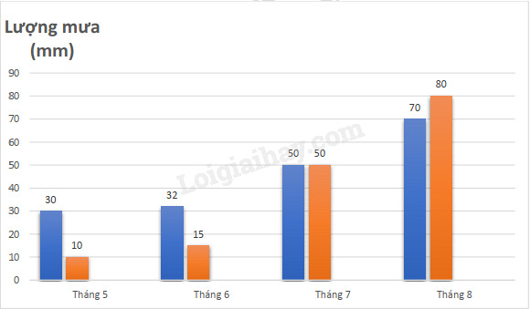 Lượng mưa trung bình của hai tỉnh A (cột trái) và B (cột phải) từ tháng 5 đến tháng 8 được cho bởi biểu đồ: