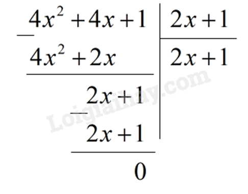 c) Ta có: \(A\left( x \right):\left( {2x + 1} \right) = \left( {4{x^2} + 4x + 1} \right):\left( {2x + 1} \right)\)