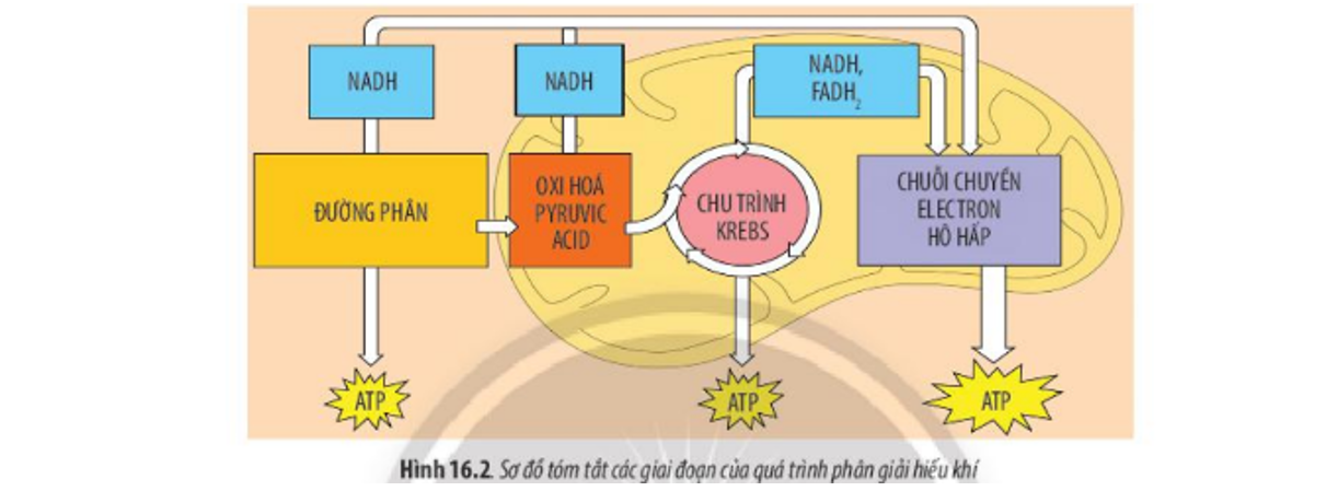Hô hấp tế bào được chia thành 3 giai đoạn nối tiếp nhau: đường phân (ở tế bào chất) → chu trình Krebs (ở chất nền ti thể) → chuỗi chuyền electron (ở màng trong ti thể).