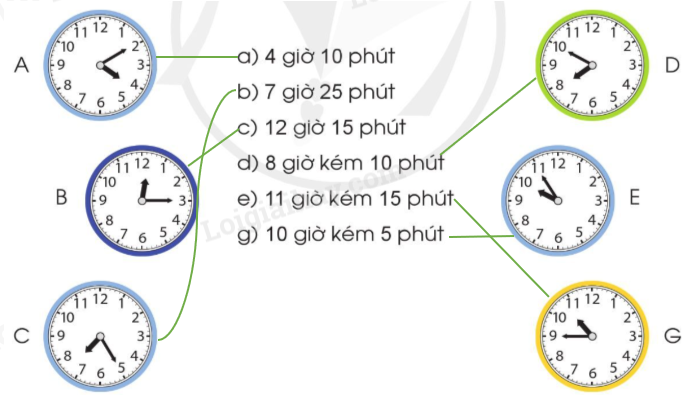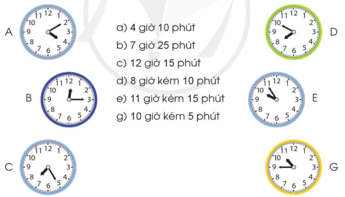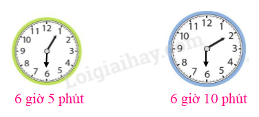 Quay kim đồng hồ để đồng hồ chỉ: 6 giờ 5 phút và 6 giờ 10 phút. Mỗi đồng hồ sau chỉ thời gian tương ứng với cách đọc nào
