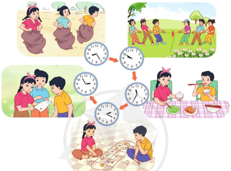 Xem đồng hồ rồi chỉ ra thời gian tương ứng cho mỗi hoạt động.