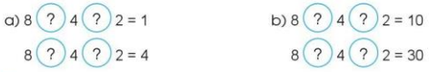 Chọn dấu (+, -, x, 🙂 hoặc dấu ngoặc () vào vị trí thích hợp để biểu thức có giá trị đúng: