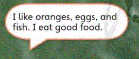Tôi thích cam, trứng, và cá. Tôi ăn đồ ăn tốt cho sức khỏe.