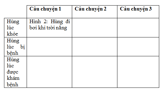 Quan sát các hình ở trang 32 SGK và viết rõ nội dung ba câu chuyện theo yêu cầu trong SGK vào bảng dưới đây (theo mẫu):