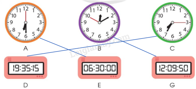 Xem giờ trên mỗi đồng hồ A, B, C rồi nối với đồng hồ điện tử chỉ cùng thời gian.