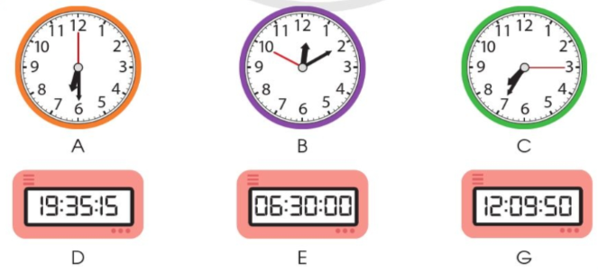 Xem giờ trên mỗi đồng hồ A, B, C rồi nối với đồng hồ điện tử chỉ cùng thời gian.