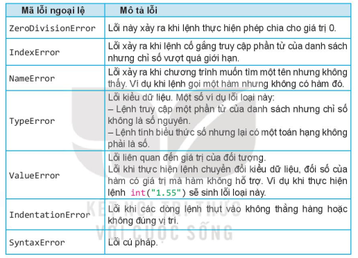 Lỗi ngoại lệ: Lỗi khi không thể thực hiện một lệnh trong chương trình. Chương trình sẽ dừng lại và thông báo một mã lỗi.