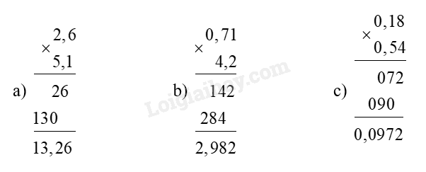 Đặt tính rồi tính: a) 2,6 × 5,1 b) 0,71 × 4,2 c) 0,18 × 0,54 Số? Tính rồi so sánh giá trị của các biểu thức. a) 6,4 × 7 và 7 × 6,4 5,3 × 8,2 và 8,2 × 5,3 b) (9,2 × 2) × 0,5 và 9,2 × (2 × 0,5)
